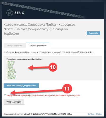 10. Στην επόμενη οθόνη μπορείτε να δείτε τη λίστα των υποψηφίων που επιλέξατε. Αν επιθυμείτε να τις αλλάξετε μπορείτε να πατήσετε στο κουμπί “Πίσω στις επιλογές ψηφοδελτίου”