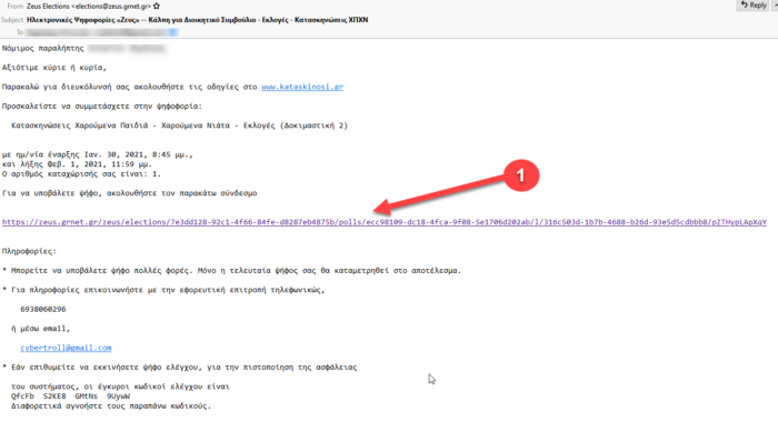 1. Στο e-mail που σας έχει έρθει πατήστε τον προσωπικό σας σύνδεσμο για να συνδεθείτε στο σύστημα εκλογών ZEYS. Δεν απαιτείται κωδικός εισόδου. ΠΡΟΣΟΧΗ: Σε περίπτωση που δεν έχετε λάβει e-mail ελέγξετε και το φάκελο με τα ανεπιθύμητα (spam) αλλιώς πάρτε μας ένα τηλέφωνο να σας το ξαναστείλουμε.