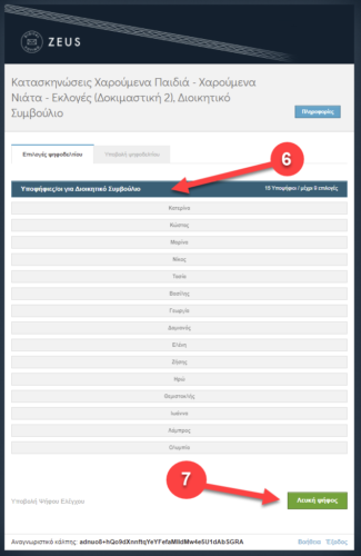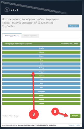 8. Όπως φαίνεται στο υπόδειγμα, οι υποψήφιες/οι έχουν ενεργοποιηθεί για επιλογή και εμφανίζονται με χρώμα μπλε. Κάνοντας κλικ πάνω σε ένα όνομα, χρωματίζεται πράσινο υποδηλώνοντας την ψήφο μας. Μπορείτε να επιλέξετε μέχρι 9 ονόματα.